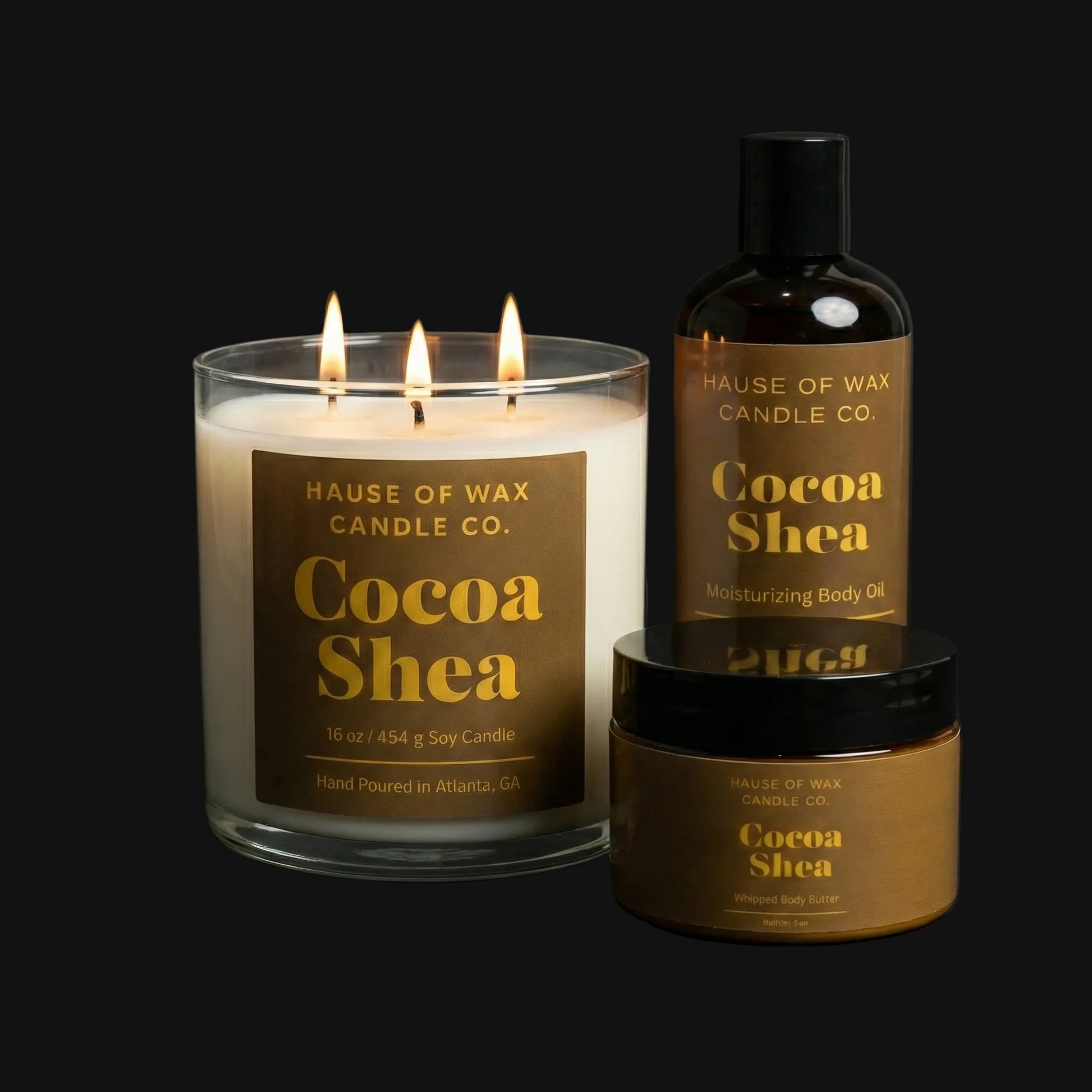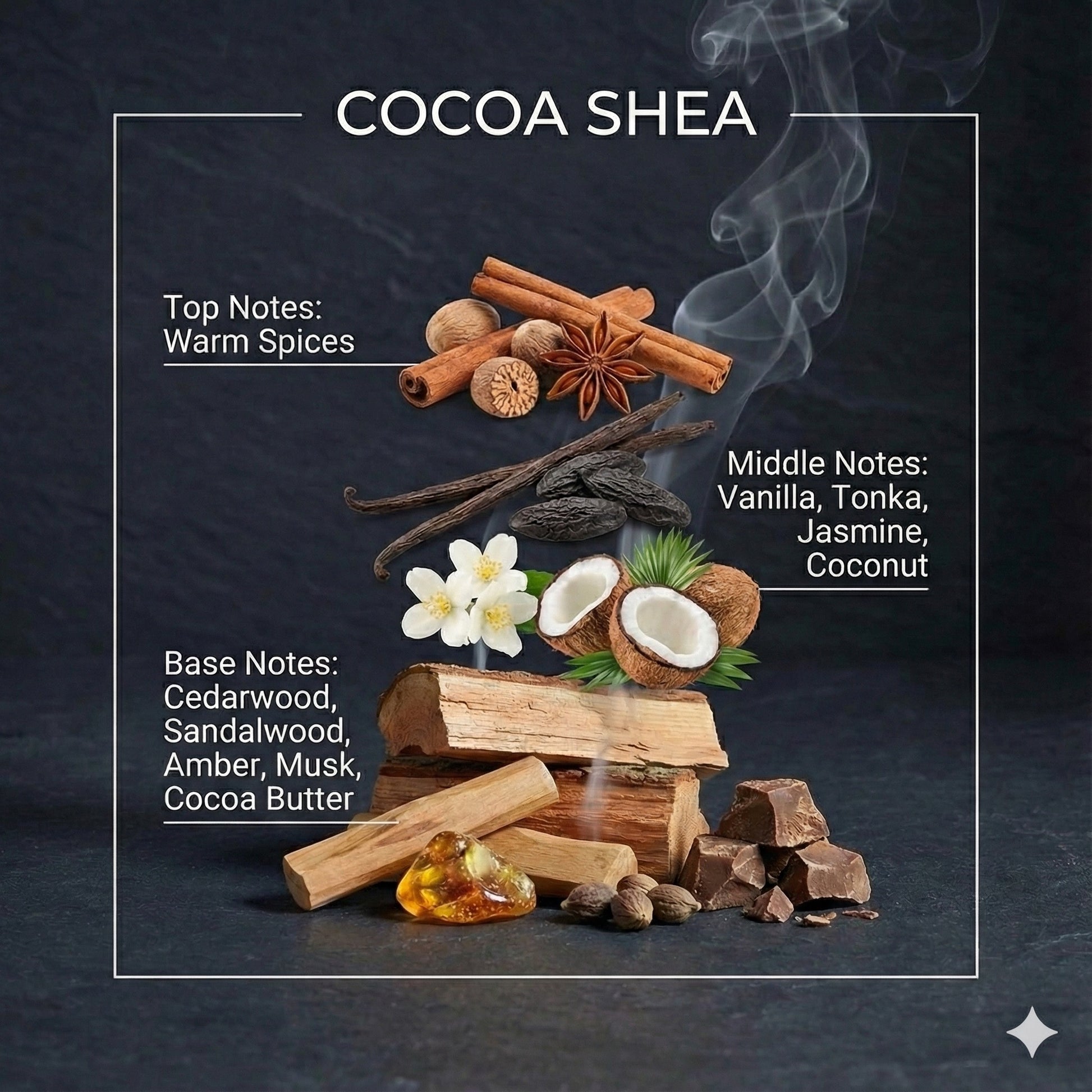 The Cocoa Shea Bundle Set wraps his space and his skin in rich comfort from start to finish. Creamy cocoa butter, a touch of warm spice, and smooth coconut move from the air to the skin—turning his home into a soft landing and his routine into a real ritual. This is for the man who wants to come home, exhale, and feel the tension leave his body the moment he steps in.Scent Notes