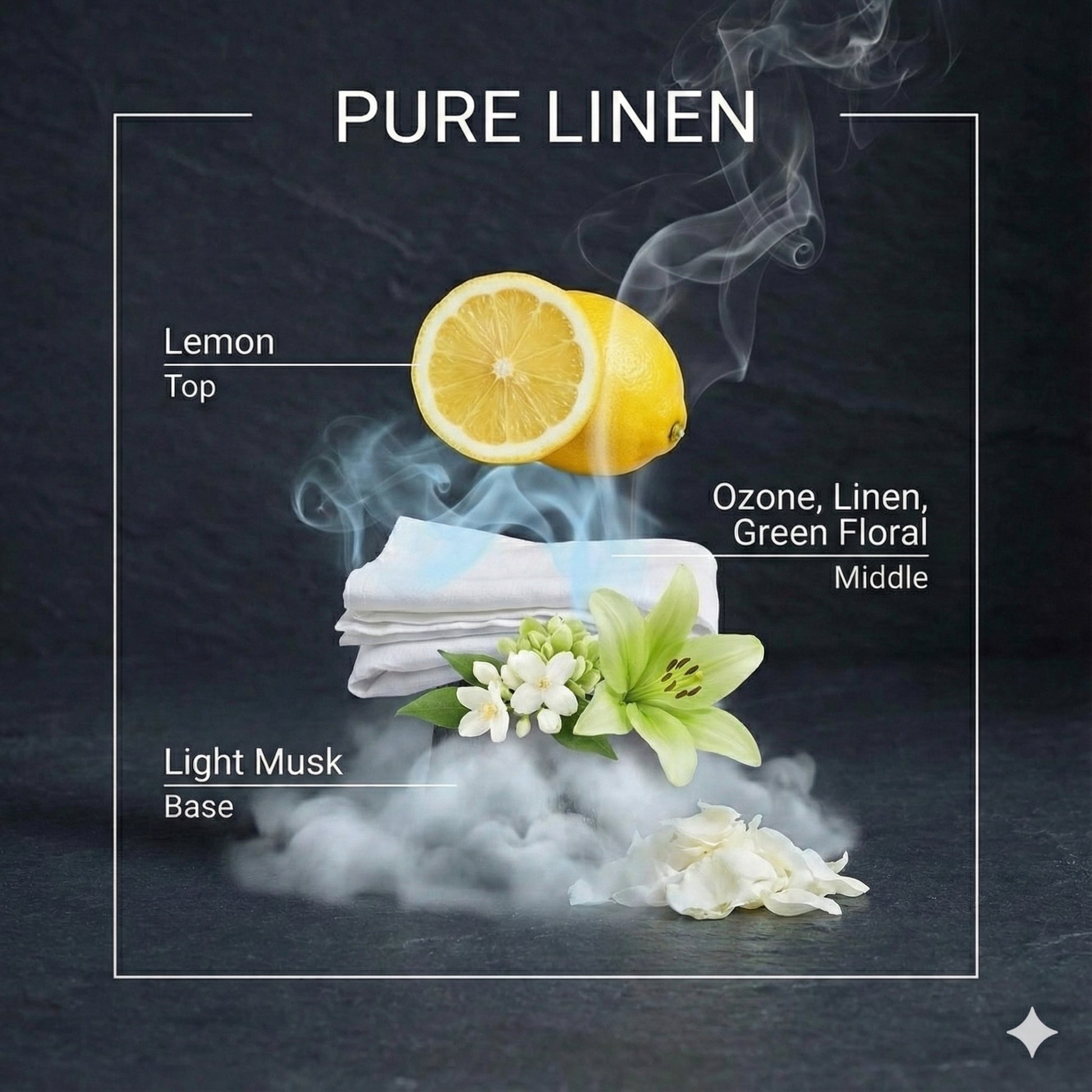 Think warm towels, fresh sheets, and a Saturday morning deep clean. Pure Linen is an airy, breathable scent that instantly lifts the heaviness out of a room. Bright lemon cuts through odors, while crisp ozone and light musk leave behind a "windows open" freshness. It doesn't smell like detergent; it smells like a fresh start.Scent Notes