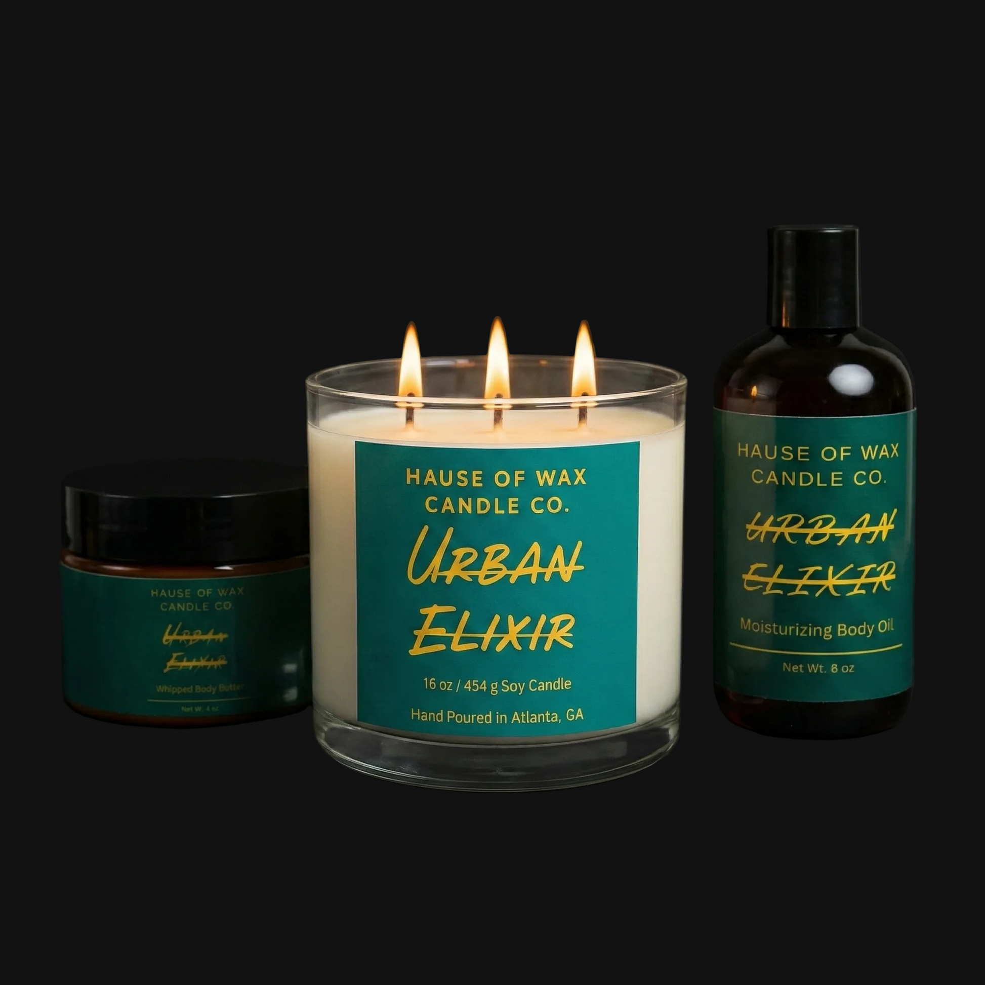 The Urban Elixir Bundle Set brings that bold, modern Urban Elixir vibe to every part of his routine—candle, body butter, and body oil working together to match his pace. Bright citrus, grounding Palo Santo, warm saffron, and smooth white patchouli move from the air to the skin, wrapping him in a confident, after-dark kind of energy that still feels grown and controlled.Scent Notes